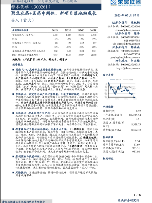 【东吴证券】【20230707】雅本化学(300261)聚焦农药+医药中间体,新项目落地助成长-34页