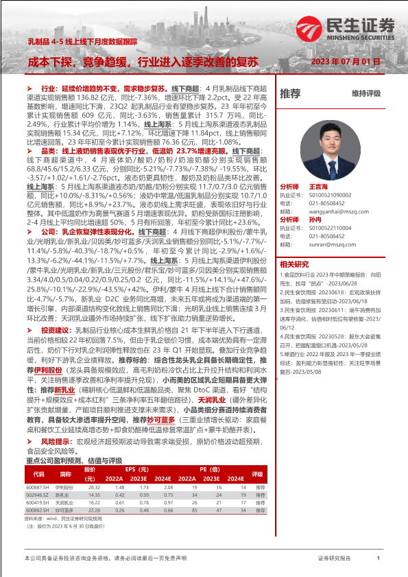 【民生证券】【20230701】食品饮料行业乳制品4_5线上线下月度数据跟踪:成本下探,竞争趋缓,行业进入逐季改善的复苏-25页