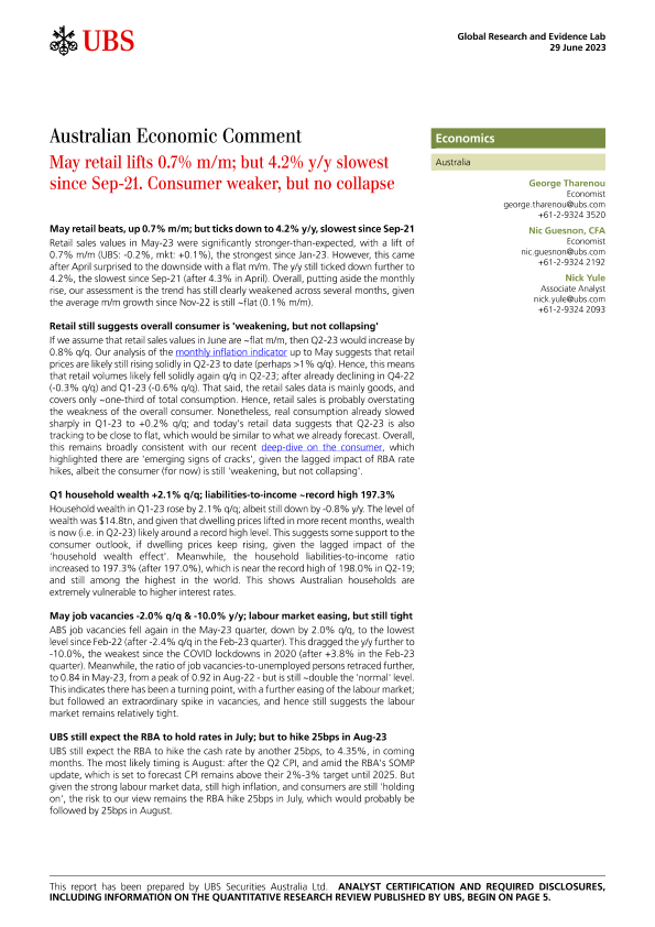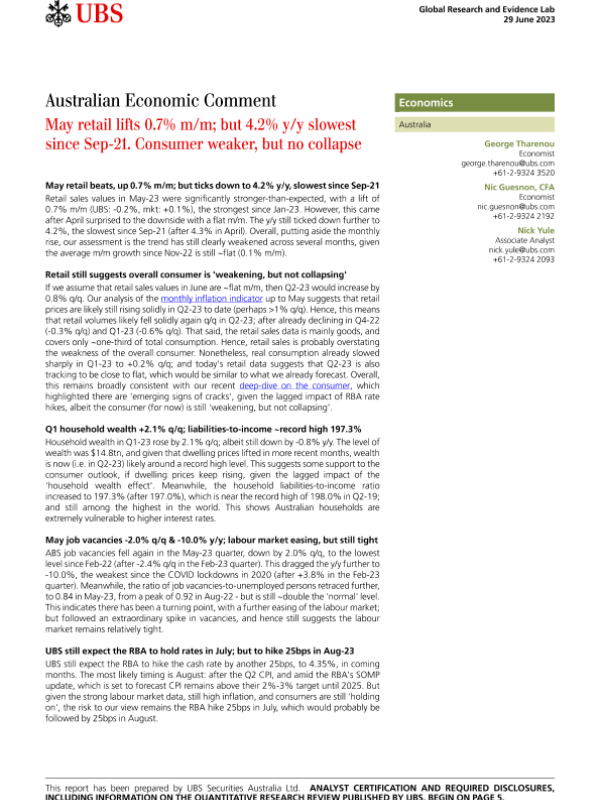 【UBS Securities Australia Ltd】【20230629】Australian Economic Comment _May retail lifts 0.7 mm; but ..-8页