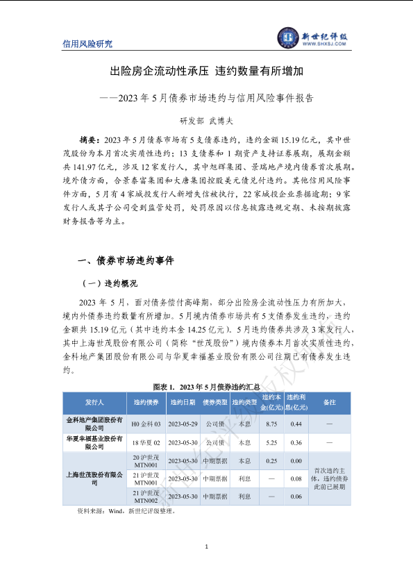 【新世纪评级】【202305】出险房企流动性承压 违约数量有所增加——2023年5月债券市场违约与信用风险事件报告-9页