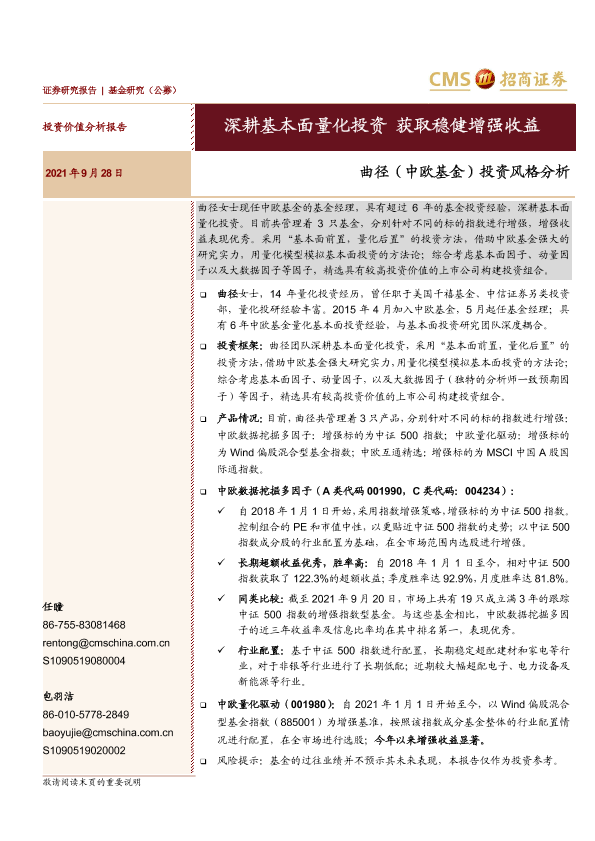 【海通证券】【20210928】曲径(中欧基金)投资风格分析:深耕基本面量化投资,获取稳健增强收益-17页