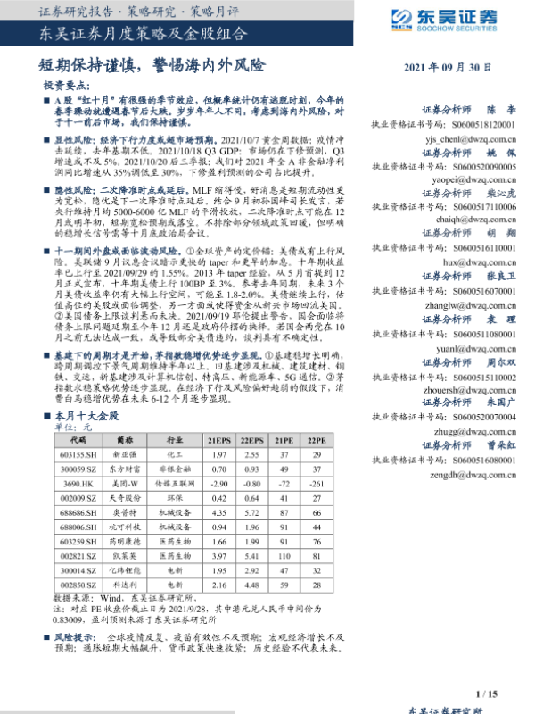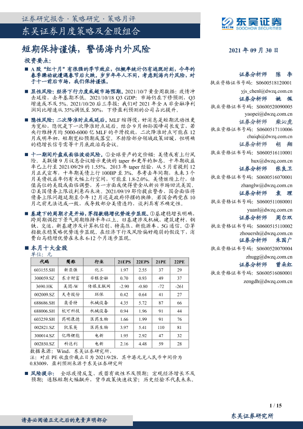 【东吴证券】【20210930】月度策略及金股组合:短期保持谨慎,警惕海内外风险-15页
