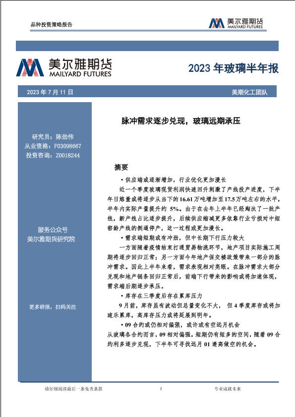 【美尔雅期货】【20230711】2023年玻璃半年报:脉冲需求逐步兑现,玻璃远期承压-16页