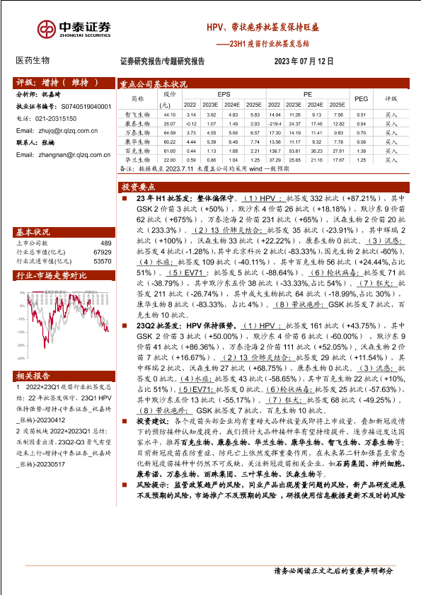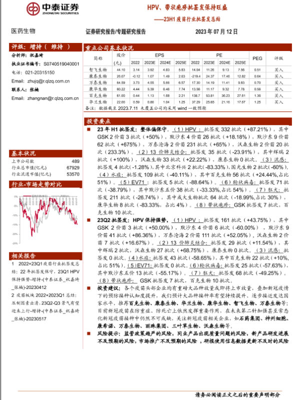 【中泰证券】【20230712】23H1疫苗行业批签发总结:HPV、带状疱疹批签发保持旺盛-16页