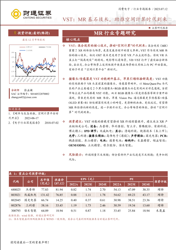MR技术 VST 消费电子 空间计算 财通证券