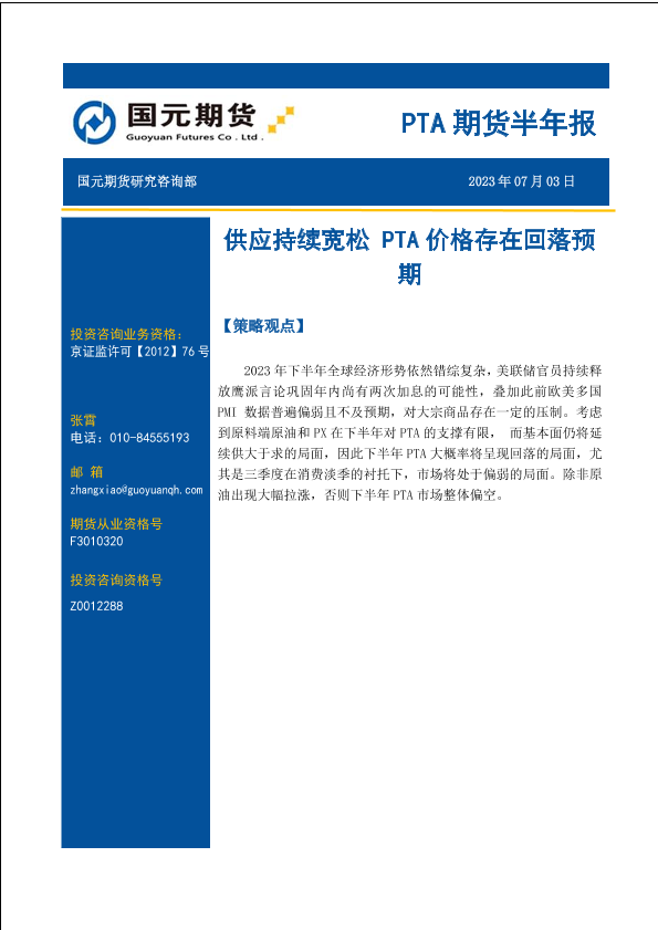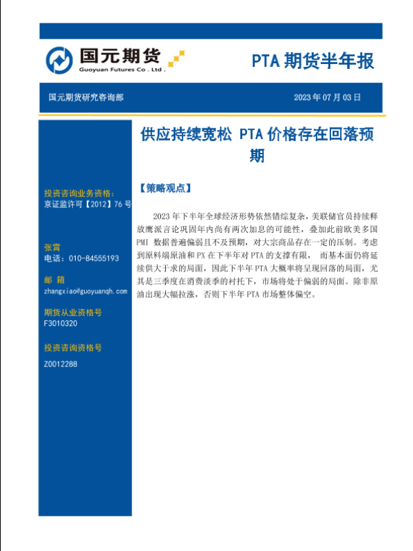 【国元期货】【20230703】PTA期货半年报:供应持续宽松,PTA价格存在回落预期-15页