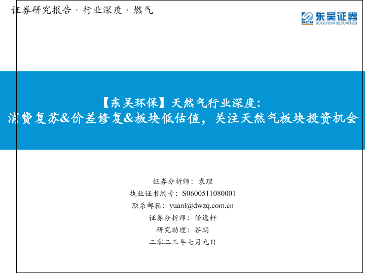 【东吴证券】【20230709】天然气行业深度:消费复苏&价差修复&板块低估值,关注天然气板块投资机会-43页