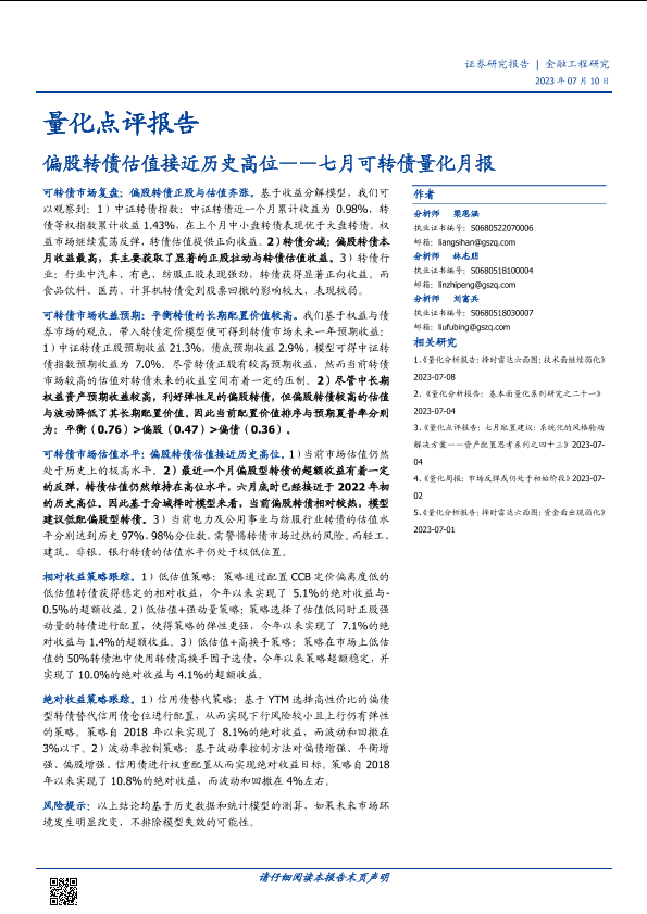 【国盛证券】【20230710】七月可转债量化月报:偏股转债估值接近历史高位-15页
