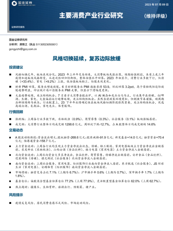 【国金证券】【20230709】主要消费产业行业:风格切换延续,复苏边际放缓-18页
