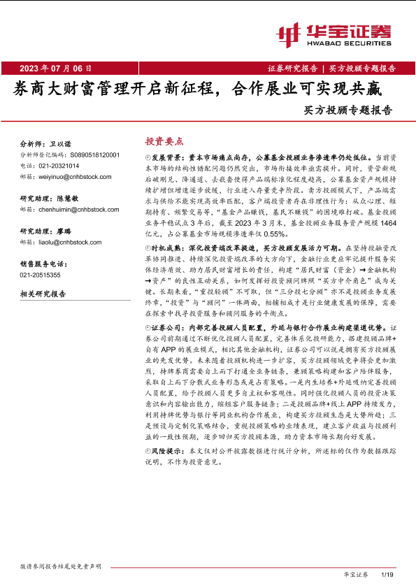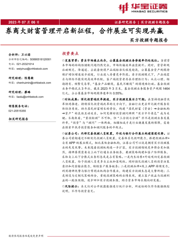 【华宝证券】【20230706】买方投顾专题报告:券商大财富管理开启新征程,合作展业可实现共赢-19页