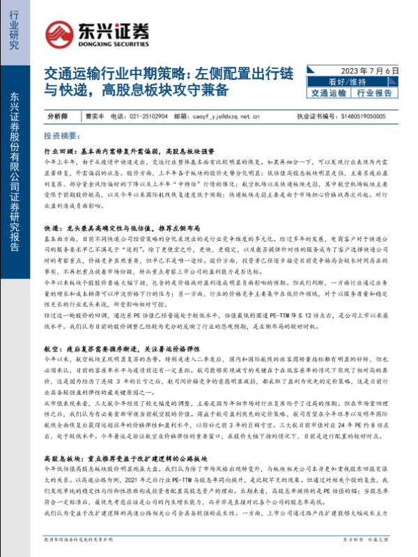 【东兴证券】【20230706】交通运输行业中期策略:左侧配置出行链与快递,高股息板块攻守兼备-19页