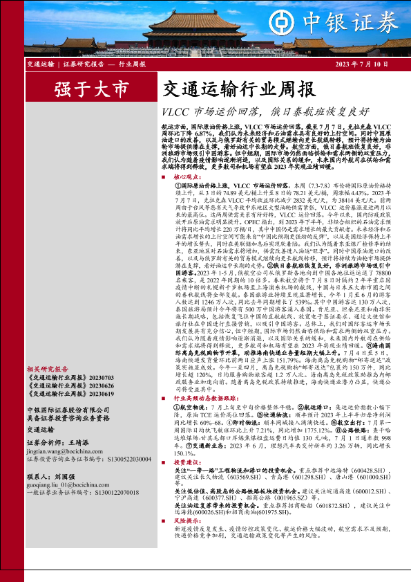 【中银证券】【20230710】交通运输行业周报:VLCC市场运价回落,俄日泰航班恢复良好-30页