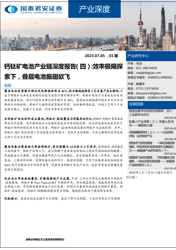 【国泰君安证券】【20230705】产业深度01期:钙钛矿电池产业链深度报告(四),效率极限探索下,叠层电池振翅欲飞-19页