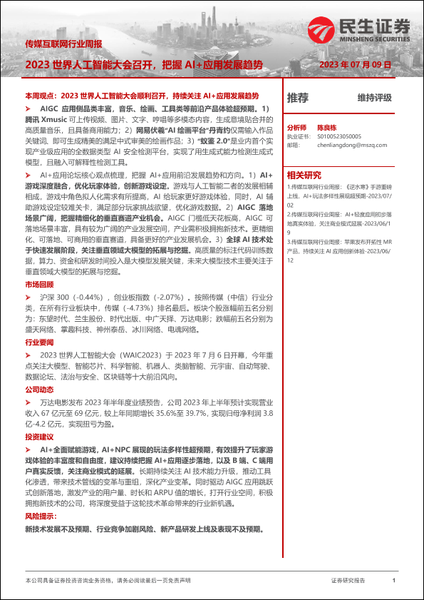 【民生证券】【20230709】传媒互联网行业周报:2023世界人工智能大会召开,把握AI+应用发展趋势-23页