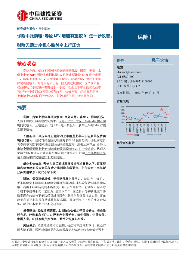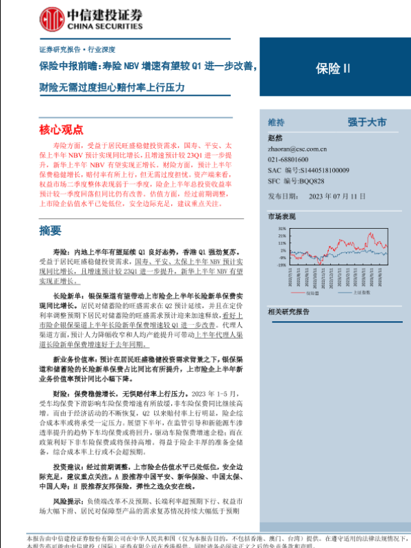 【中信建投证券】【20230711】保险行业中报前瞻:寿险NBV增速有望较Q1进一步改善,财险无需过度担心赔付率上行压力-22页
