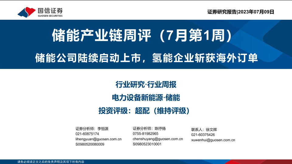 【国信证券】【20230709】储能产业链周评(7月第1周):储能公司陆续启动上市,氢能企业斩获海外订单-28页