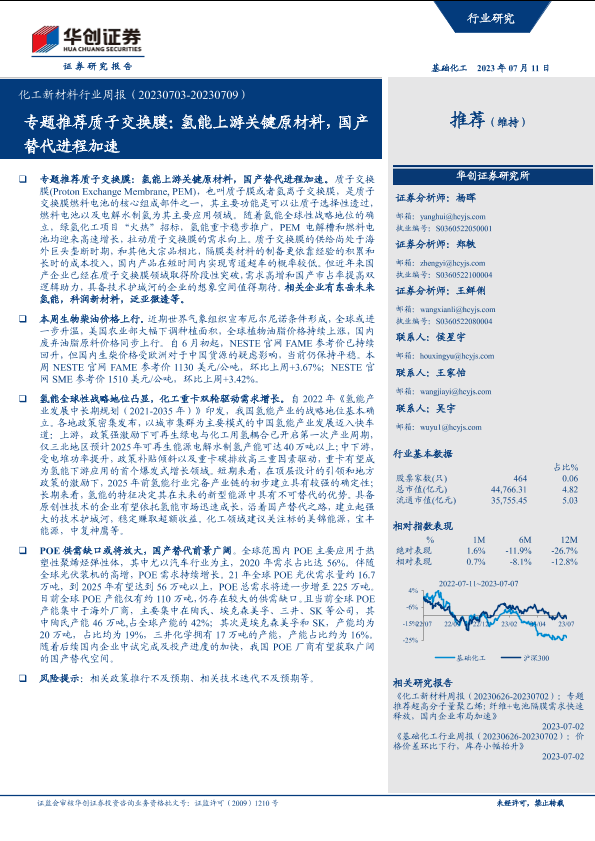 【华创证券】【20230711】化工新材料行业周报:专题推荐质子交换膜:氢能上游关键原材料,国产替代进程加速-65页