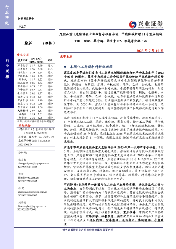 【兴业证券】【20230710】报:危化品重大危险源企业部级督导核查启动,节能降碳新增11个重点领域TDI、醋酸、草甘膦、维生素B2、液氨等价格上涨-45页