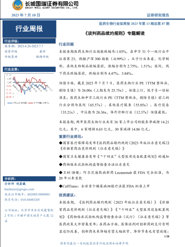 【长城国瑞证券】【20230710】医药生物行业双周报2023年第13期总第87期:《谈判药品续约规则》专题解读-28页