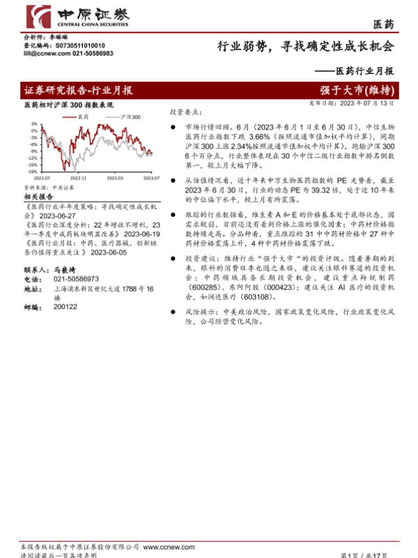 【中原证券】【20230713】医药行业月报:行业弱势,寻找确定性成长机会-17页