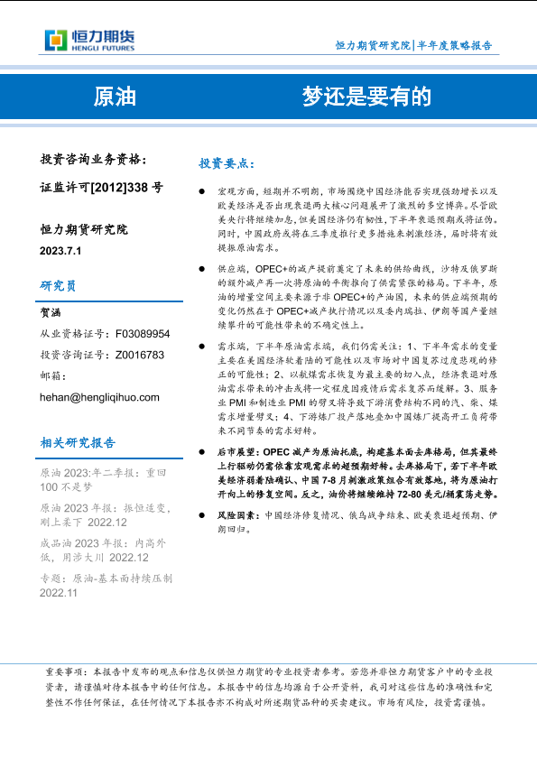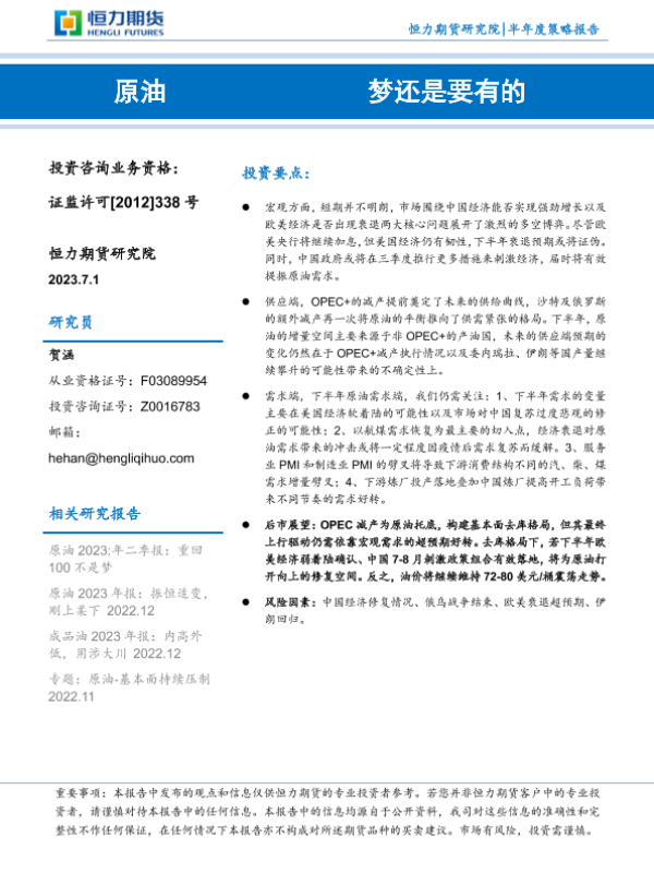 【恒力期货】【20230701】原油半年度策略报告:梦还是要有的-21页