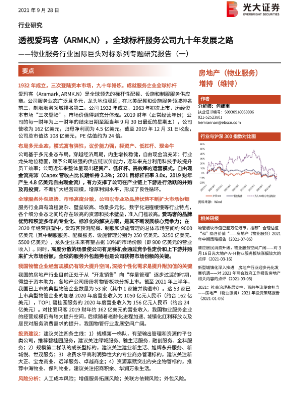 【光大证券】【20210928】物业服务行业国际巨头对标系列专题研究报告(一):透视爱玛客(ARMK.N),全球标杆服务公司九十年发展之路-26页