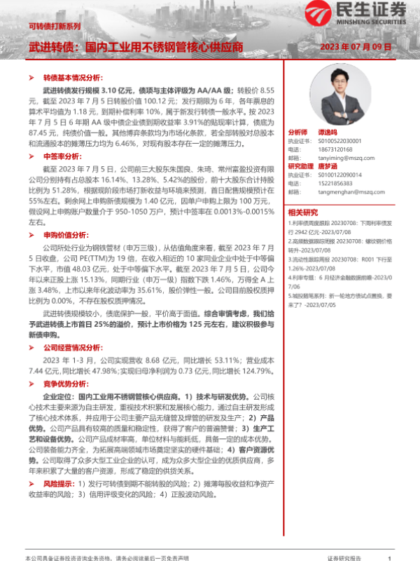 【民生证券】【20230709】可转债打新系列:武进转债,国内工业用不锈钢管核心供应商-15页