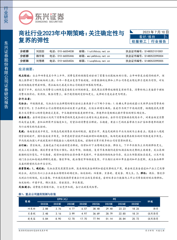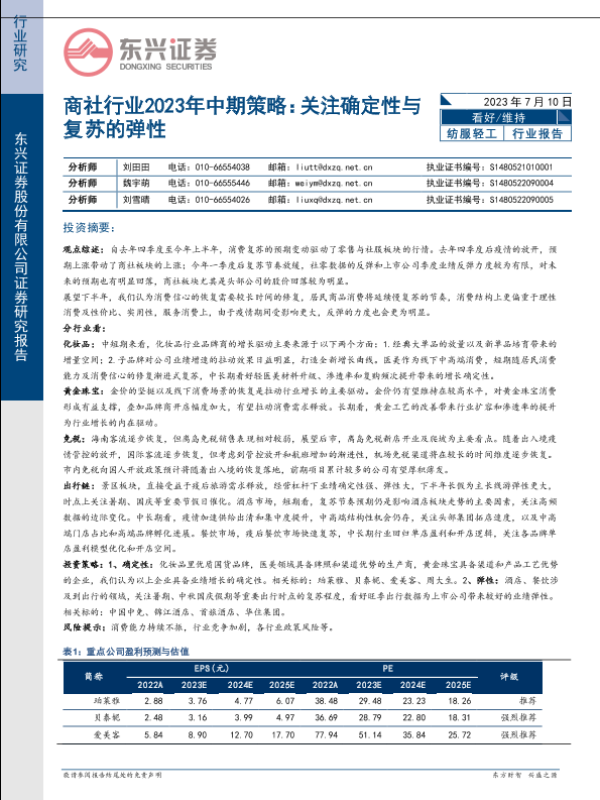 化妆品 商社行业 投资策略 消费复苏 黄金珠宝