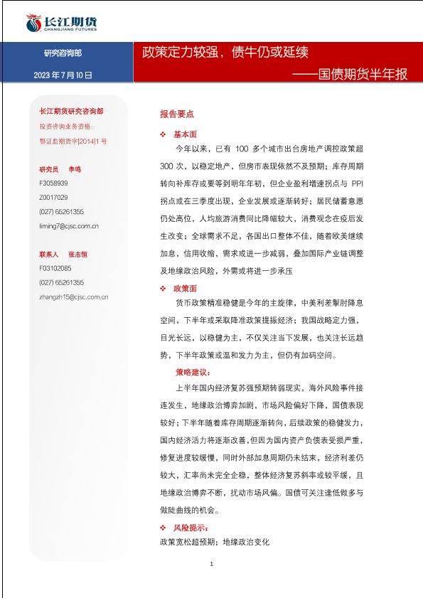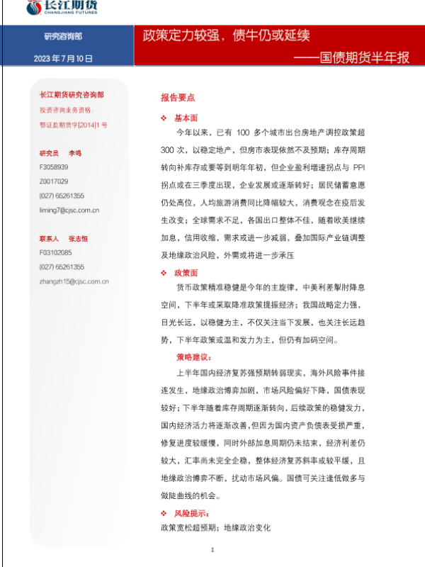 【长江期货】【20230710】国债期货半年报:政策定力较强,债牛仍或延续-15页