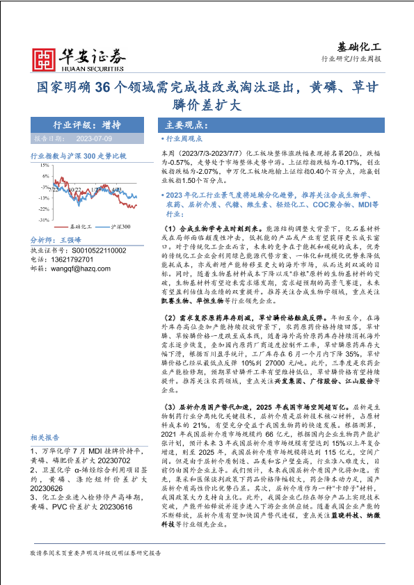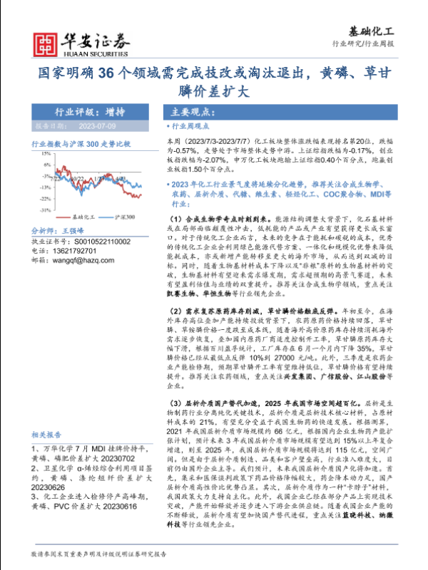 【华安证券】【20230709】基础化工行业周报:国家明确36个领域需完成技改或淘汰退出,黄磷、草甘膦价差扩大-43页