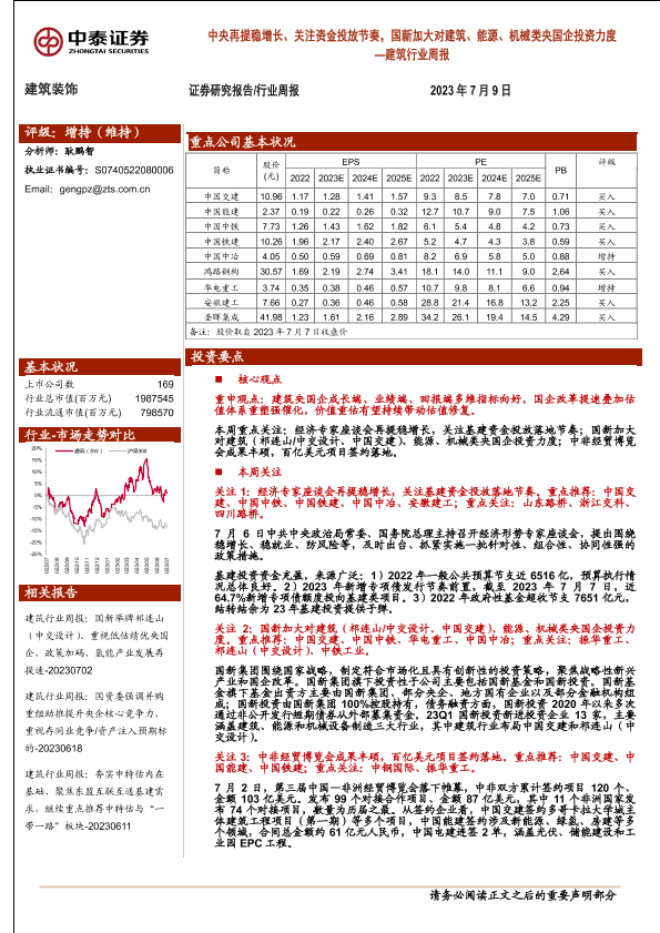 【中泰证券】【20230709】建筑行业周报:中央再提稳增长、关注资金投放节奏,国新加大对建筑、能源、机械类央国企投资力度-28页