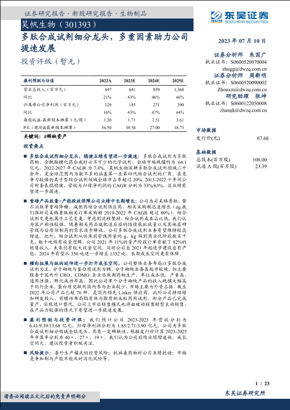 【东吴证券】【20230710】昊帆生物(301393)多肽合成试剂细分龙头,多重因素助力公司提速发展-23页