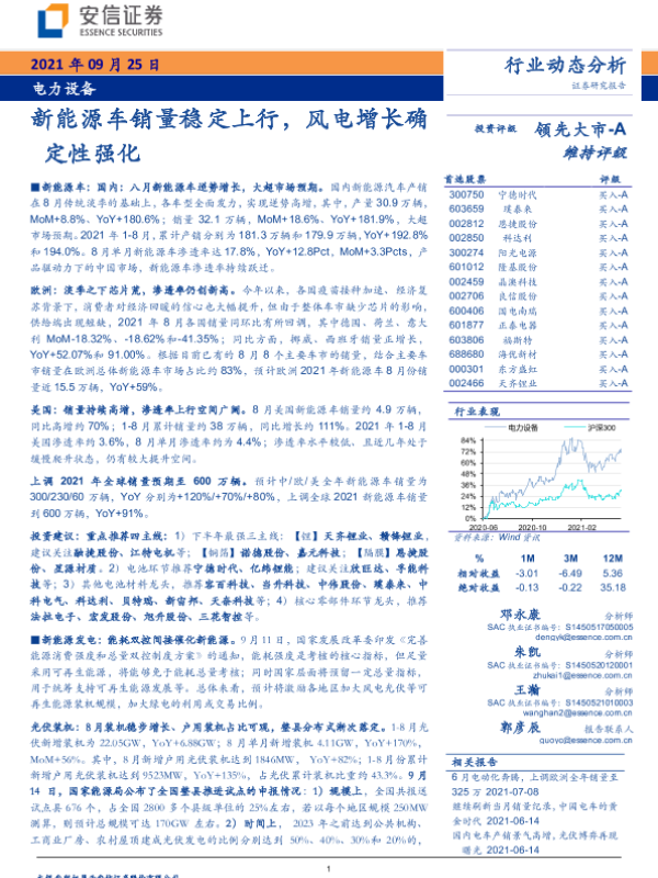 【安信证券】【20210925】电力设备行业:新能源车销量稳定上行,风电增长确定性强化-28页