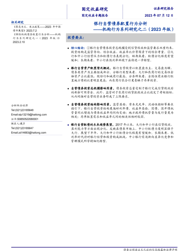 【海通证券】【20230712】机构行为系列研究之二(2023年版):银行自营债券配置行为分析-18页