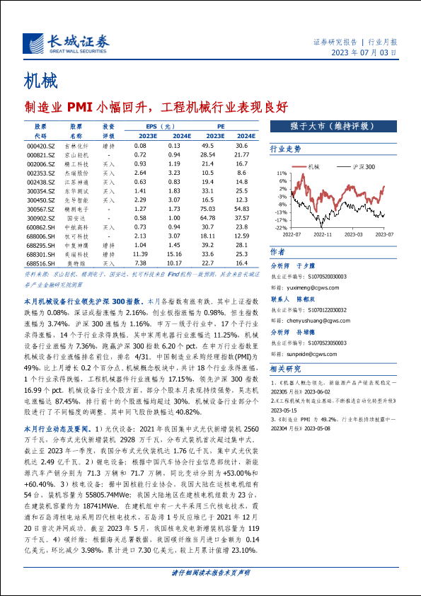 【长城证券】【20230703】机械行业月报:制造业PMI小幅回升,工程机械行业表现良好-18页