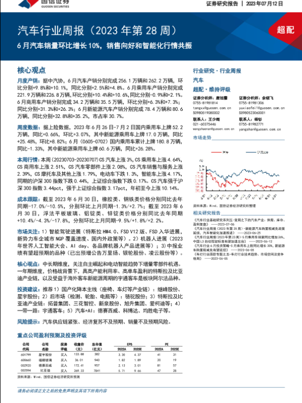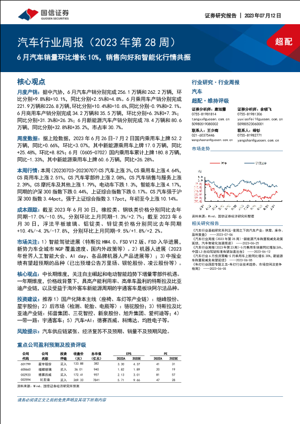 【国信证券】【20230712】汽车行业周报(2023年第28周):6月汽车销量环比增长10%,销售向好和智能化行情共振-34页