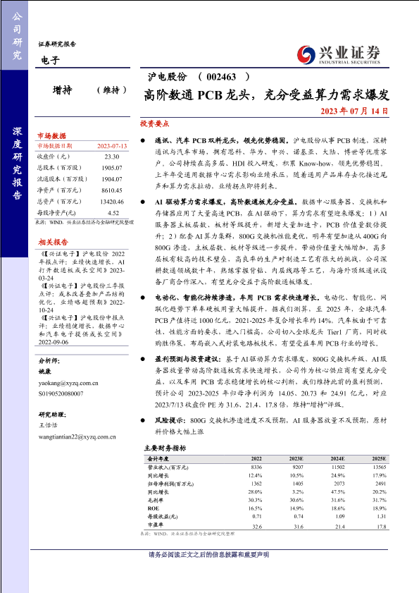 【兴业证券】【20230714】高阶数通PCB龙头,充分受益算力需求爆发-30页