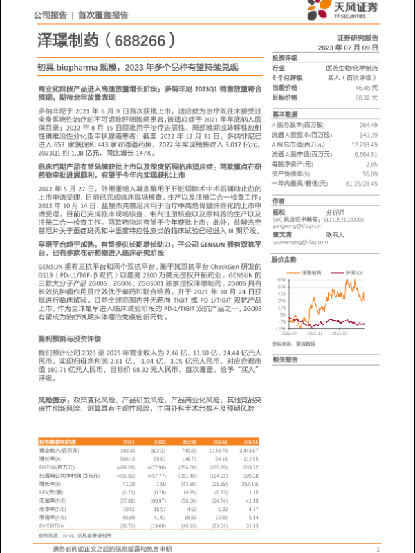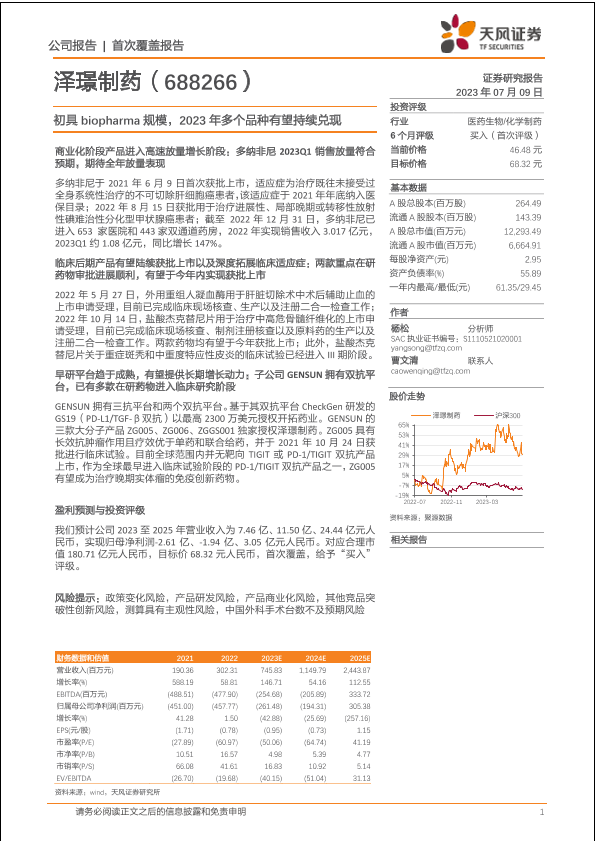 【天风证券】【20230709】泽璟制药(688266)初具biopharma规模,2023年多个品种有望持续兑现-43页