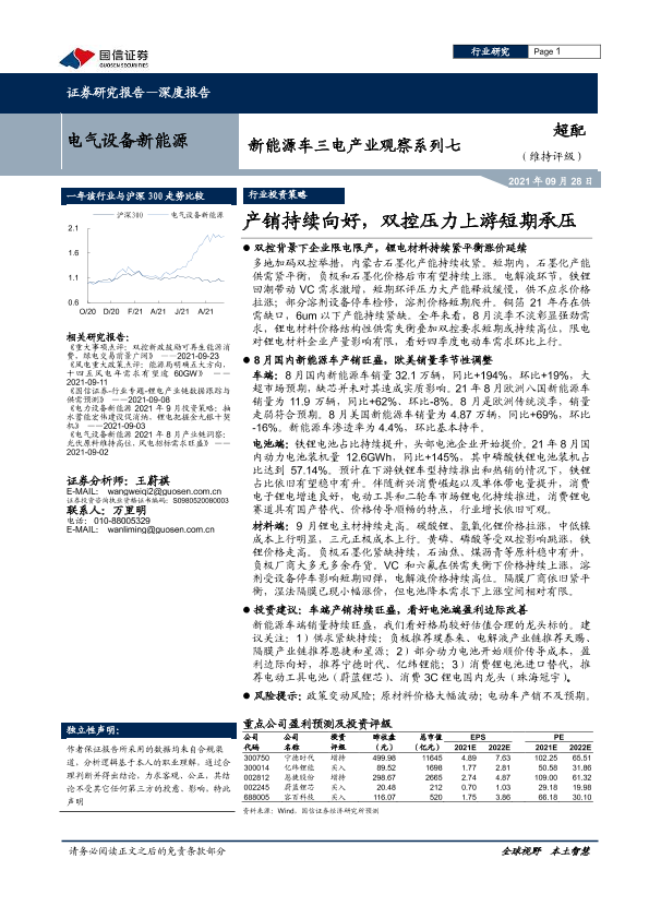 【国信证券】【20210928】电气设备新能源行业新能源车三电产业观察系列七:产销持续向好,双控压力上游短期承压-38页