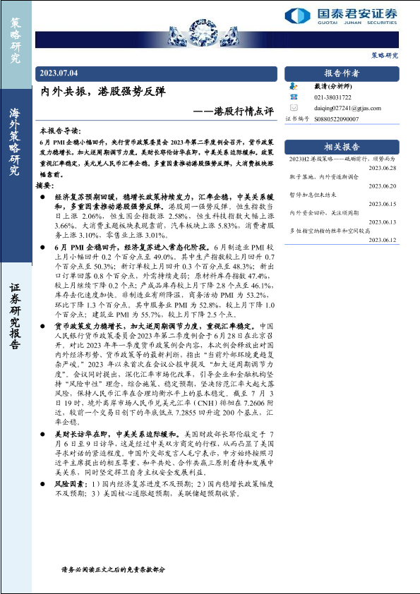 【国泰君安证券】【20230704】内外共振,港股强势反弹——港股行情点评-16页