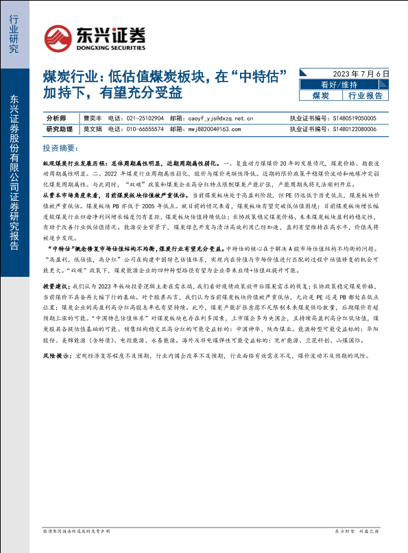 【东兴证券】【20230706】煤炭行业:低估值煤炭板块,在“中特估” 加持下,有望充分受益-18页
