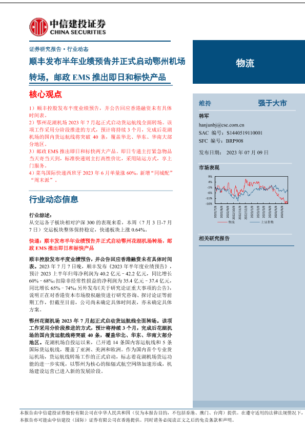 【中信建投证券】【20230709】物流行业:顺丰发布半年业绩预告并正式启动鄂州机场转场,邮政EMS推出即日和标快产品-24页