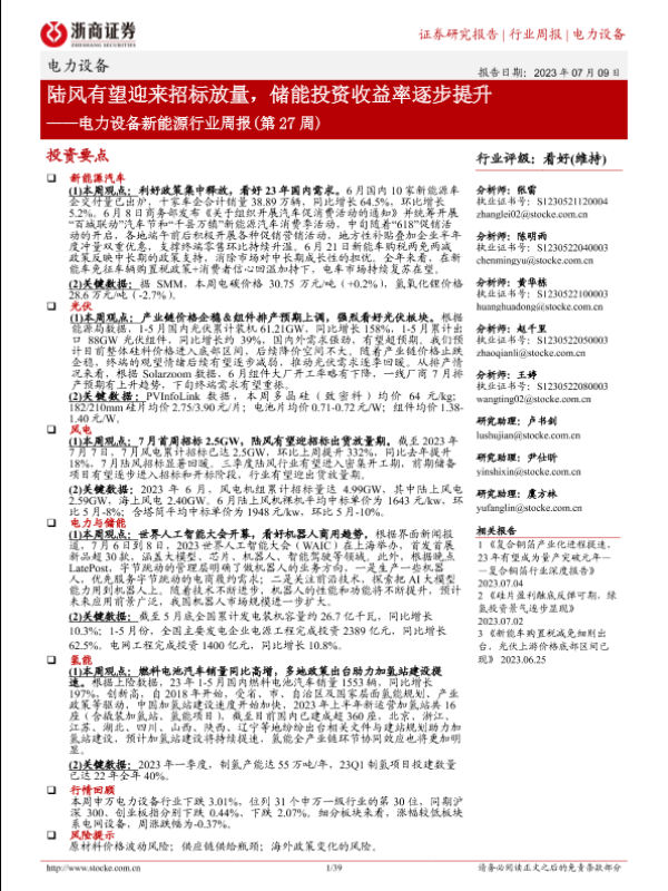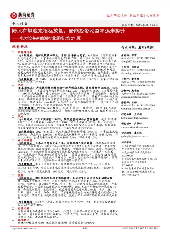 【浙商证券】【20230709】电力设备新能源行业周报(第27周):陆风有望迎来招标放量,储能投资收益率逐步提升-39页