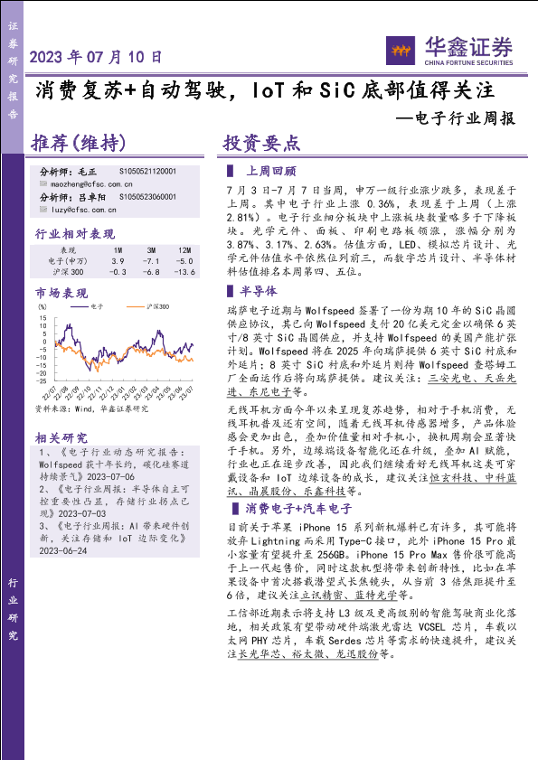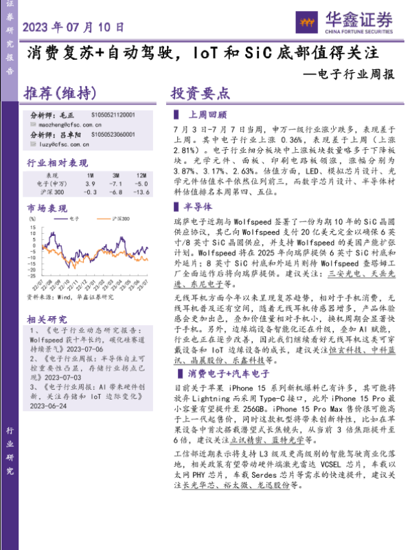 【华鑫证券】【20230710】电子行业周报:消费复苏+自动驾驶,IoT和SiC底部值得关注-40页