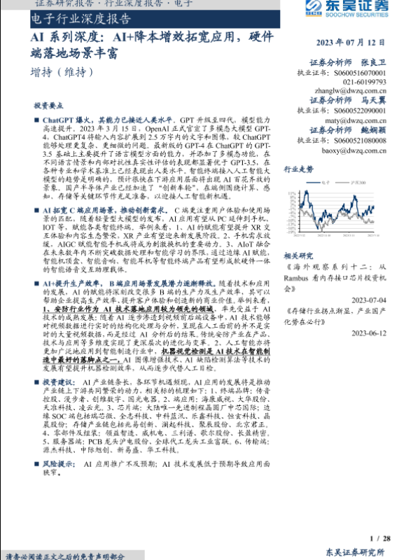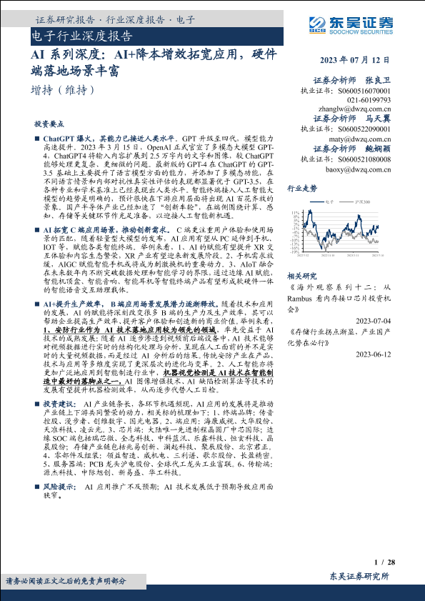 【东吴证券】【20230712】电子行业深度报告:AI系列深度,AI+降本增效拓宽应用,硬件端落地场景丰富-28页