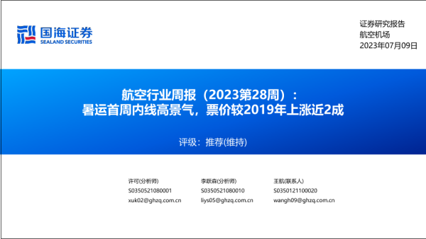 【国海证券】【20230709】航空行业周报(2023第28周):暑运首周内线高景气,票价较2019年上涨近2成-23页