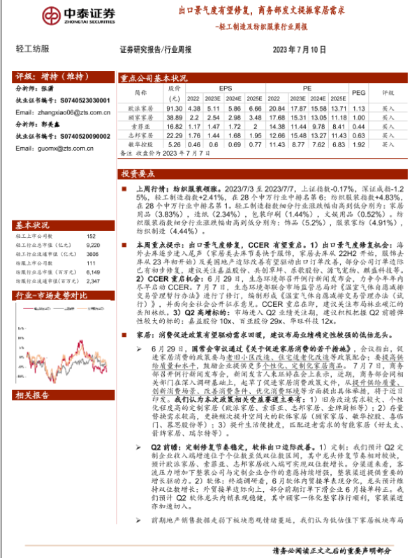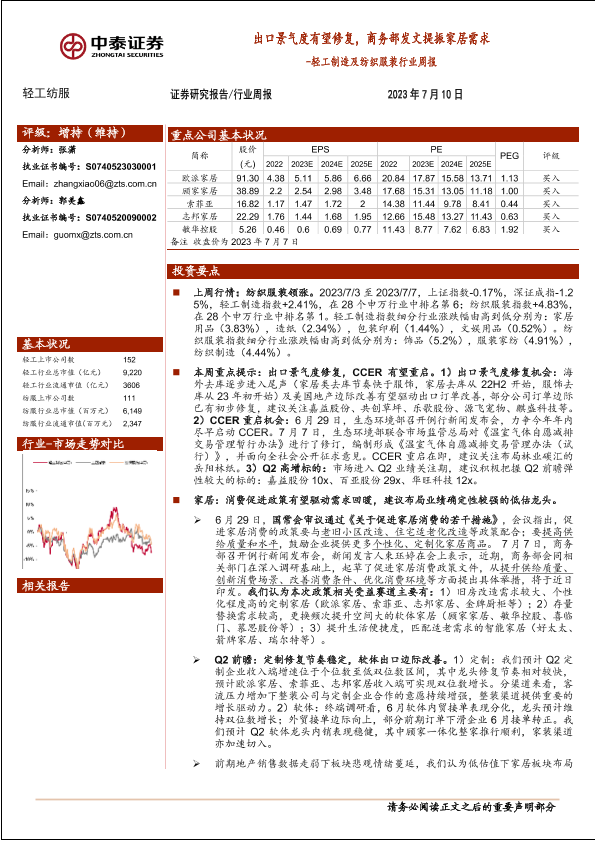 【中泰证券】【20230710】轻工制造及纺织服装行业周报:出口景气度有望修复,商务部发文提振家居需求-21页