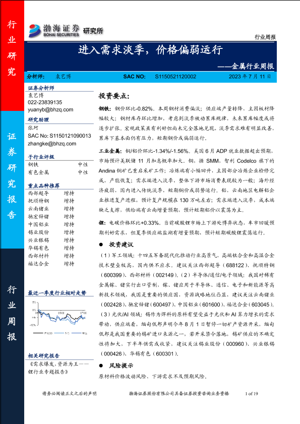 【渤海证券】【20230711】金属行业周报:进入需求淡季,价格偏弱运行-19页