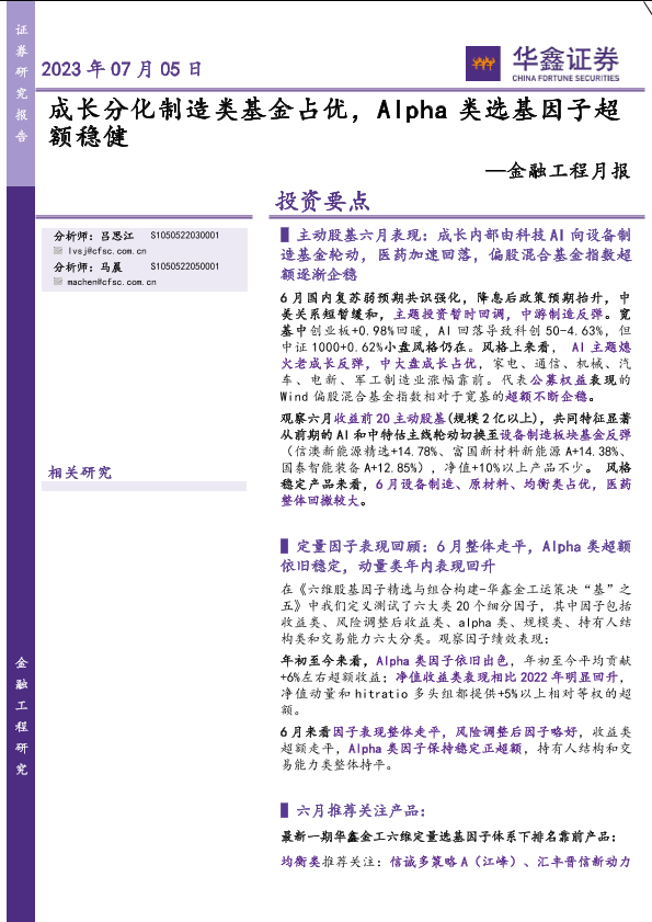 【华鑫证券】【20230705】金融工程月报:成长分化制造类基金占优,Alpha类选基因子超额稳健-15页
