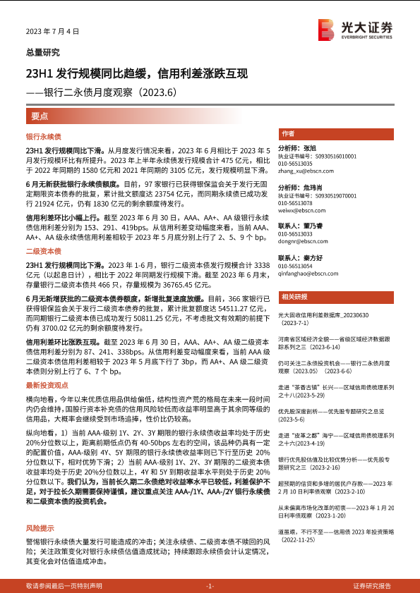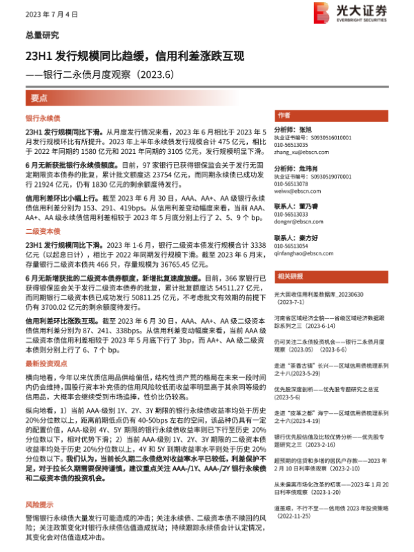 【光大证券】【20230704】银行二永债月度观察:23H1发行规模同比趋缓,信用利差涨跌互现-16页